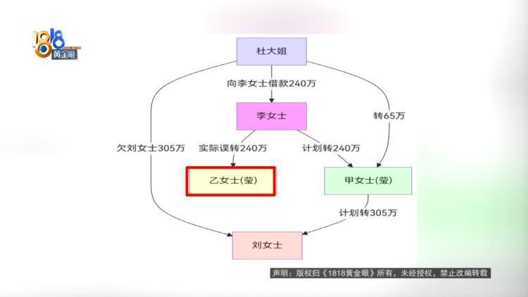 李女士说,她和杜大姐把钱转给她们共同的朋友,这位朋友暂且称为甲女士,由甲女士把305万转给刘女士。为什么要这样操作呢?李女士解释是为了资金安全起见,甲女士单名一个“莹”字,李女士说她把240万转给甲女士的时候,错转给了另一个人,这个人暂且称为乙女士,单名也是一个“莹”字。